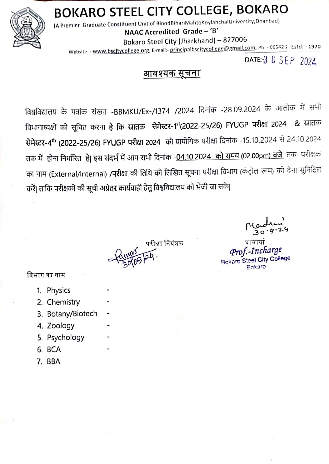 External practical examination of UG Sem VI & Old session is to be conducted from 06-08-2024 to 16-08-2024.